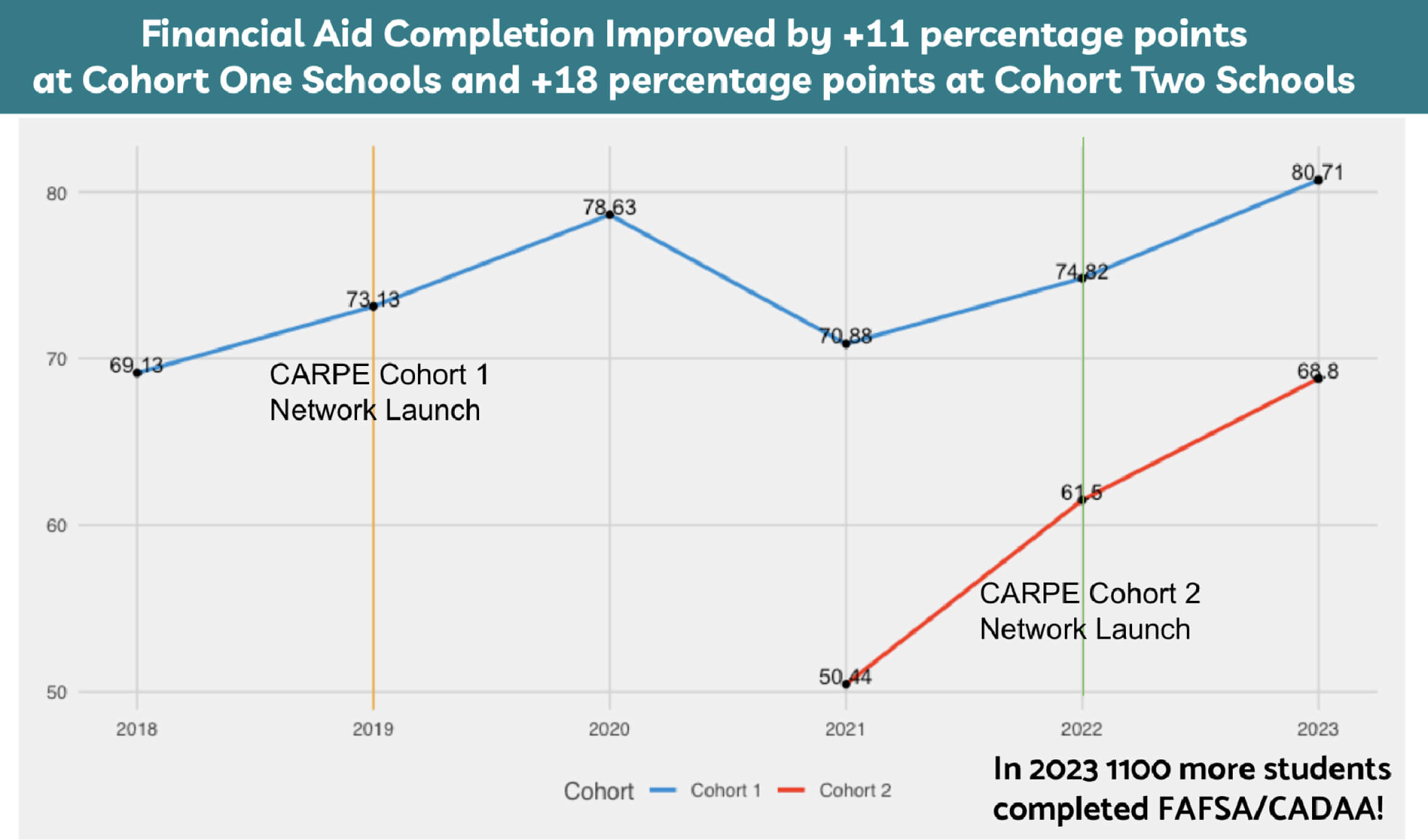 Using the Financial Aid Application Completion measure has encouraged school teams to shift their mindset about how to best support students in their college journey. Instead of waiting to provide assistance to students who ask for it, college counseling teams review the data and take a more proactive approach by providing support for students who need it at that moment. Additionally, this measure effectively transforms state-level aggregate data into practical information that school teams can use to design interventions that increase college access for traditionally underrepresented students. According to CARPE College Access Network’s website, schools in their network have measurably increased college access and improved financial aid completion rates by 11 percentage points for schools that joined the network in 2019 and 18 percentage points for schools that joined in 2021.
