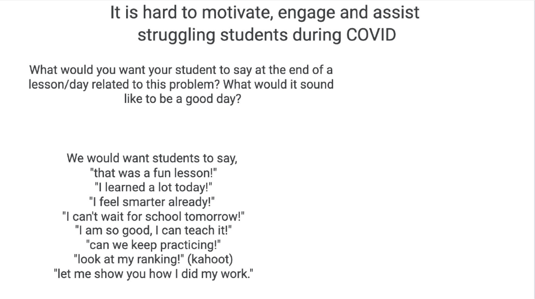The Student Engagement Exit Ticket survey, though not currently in use, offers improvement practitioners important considerations for the development and implementation of practice-based measures. The collaborative design and use of this measure spotlights a countercultural, simple approach that is accessible and can alleviate the burden on practitioners while also elevating their voice in the development process. To develop this measure, Annie and several other collaborators met virtually with the school principal and 15-20 teachers to identify problems of practice they wanted to work on, ranging from the use of technology for instruction to relationship building with students. Based on shared problems of practice, teachers worked together on a virtual whiteboard (Jamboard) to develop look-fors and brainstorm statements they wanted students to say at the end of a lesson with respect to their focal problem areas.